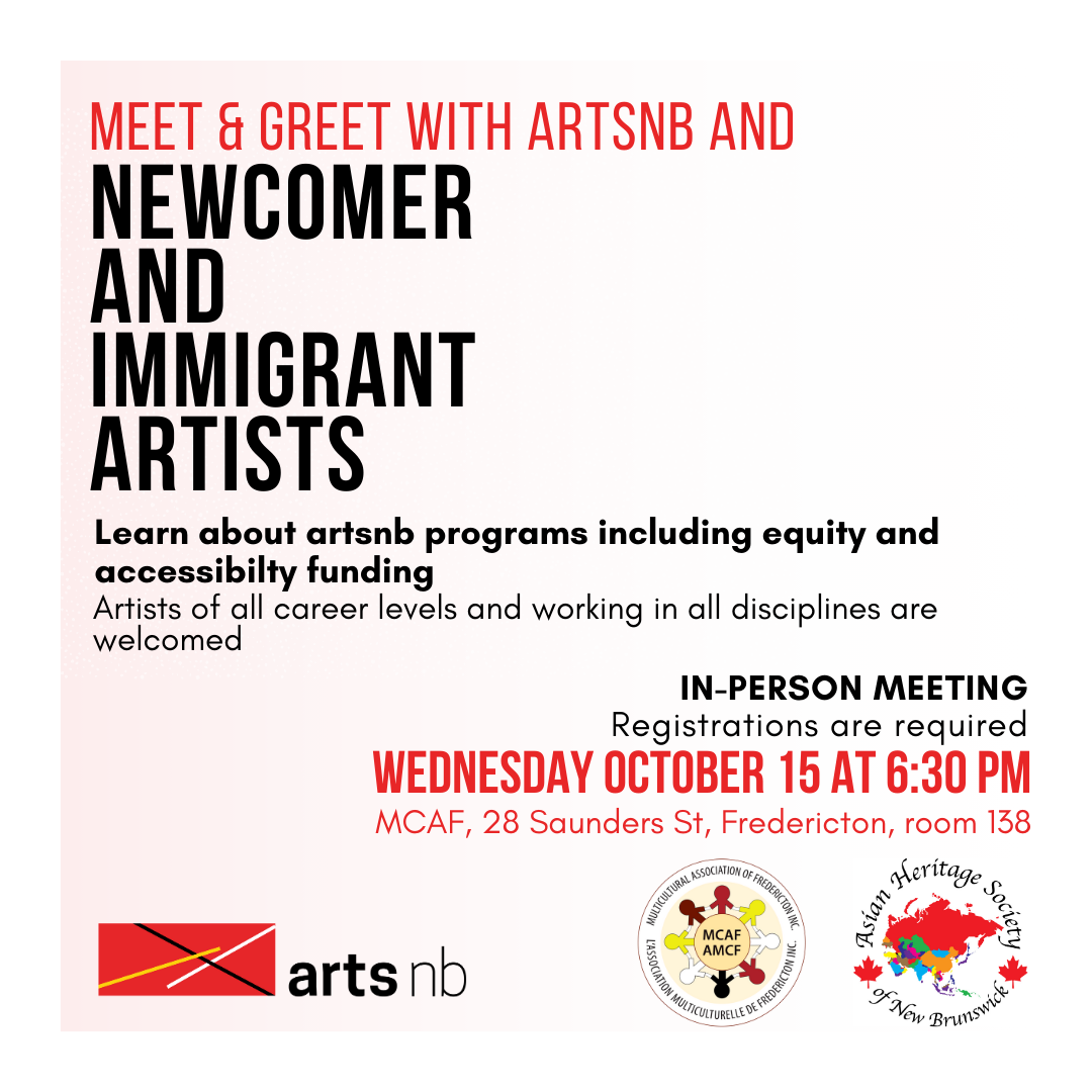 FOR NEWCOMER AND IMMIGRANT ARTISTS OF ALL CAREER LEVELS, WORKING IN ALL DISCIPLINES artsnb is proud to partner with the Asian Heritage Society of New Brunswick (AHSNB) and the Multicultural Association of Fredericton (MCAF) to present on our programs and resources for artists.* Come meet and chat with Emilio Q. Bonnell, from the artsnb team!