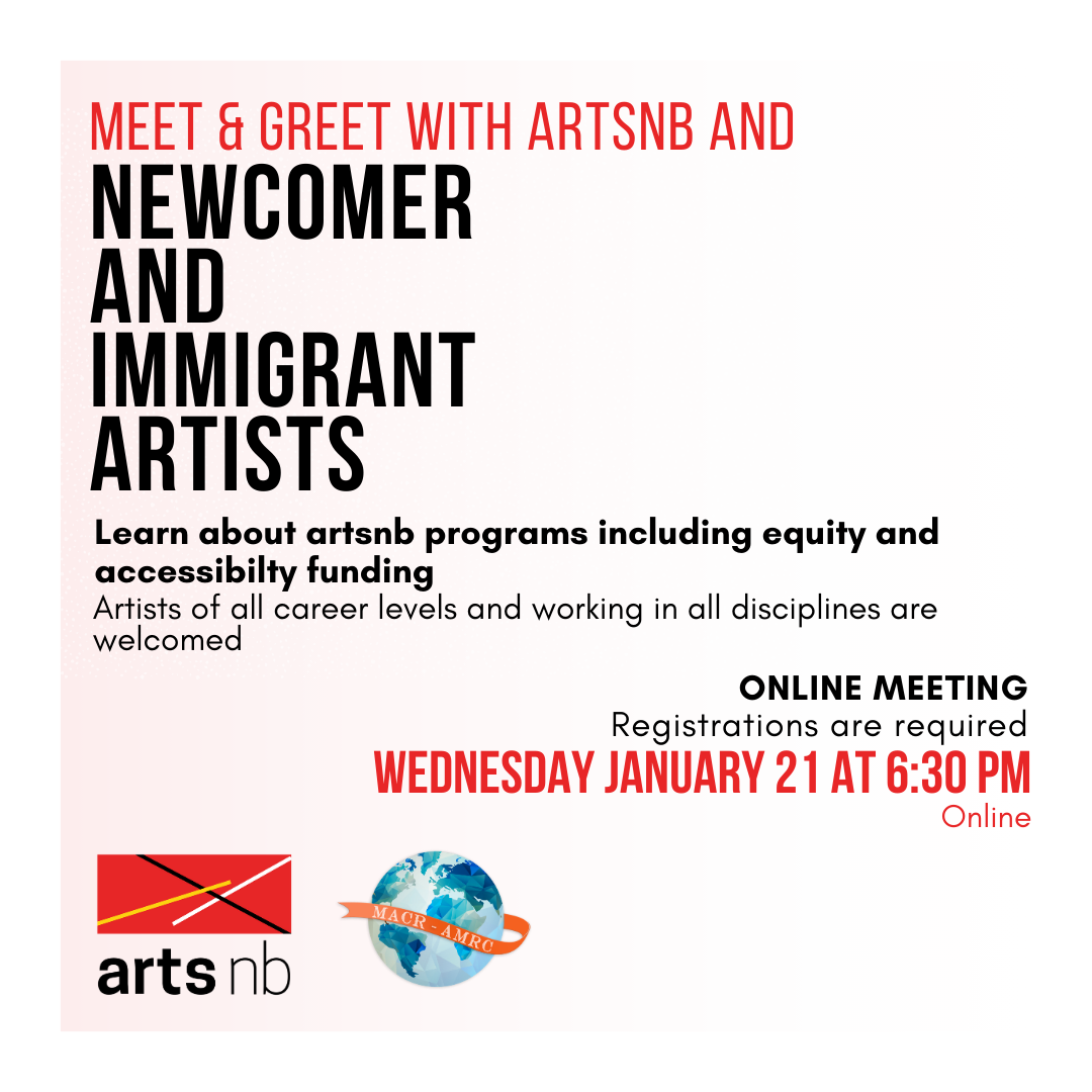 FOR NEWCOMER AND IMMIGRANT ARTISTS OF ALL CAREER LEVELS, WORKING IN ALL DISCIPLINES artsnb is proud to partner with Multicultural Association Chaleur Region to present on our programs and resources for artists.* Come meet and chat with Cheryl Lavigne, from the artsnb team! ➡WHERE:Online, the meeting link will be shared upon registration.➡WHEN:Wednesday January 21, 2026,
