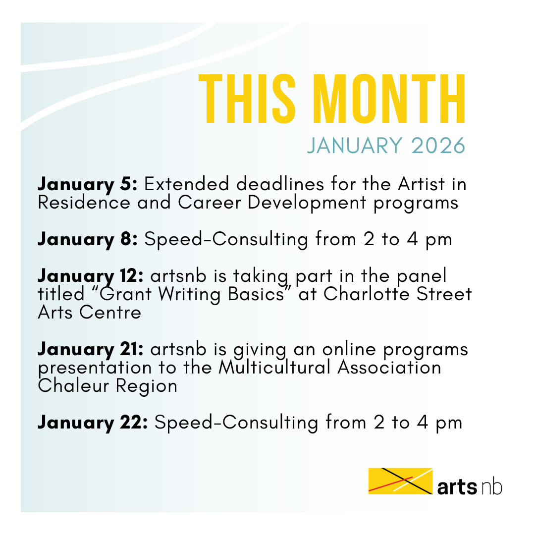 What’s happening at artsnb in January? January 5: Extended deadlines for the Artist in Residence and Career Development programs. Find more information on these programs here. January 8: Speed-Consulting from 2 to 4 pm. Find more information on Speed-Consulting here. January 12: artsnb is taking part in the panel titled “Grant Writing Basics” at Charlotte