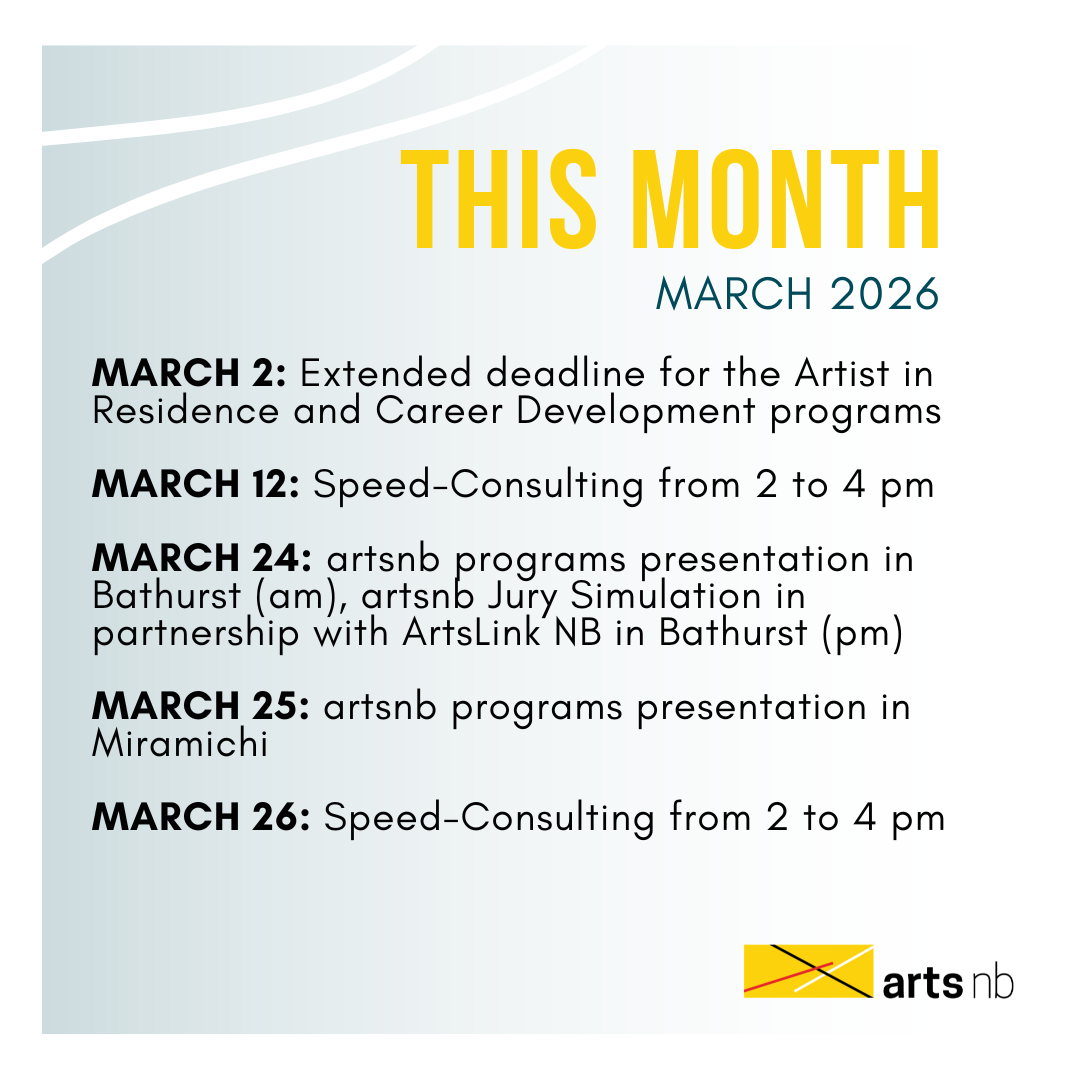 What’s happening at artsnb in December? December 8-12: Results are released for the October 1 deadline of the Creation and Documentation programs. Find them on the Results page here. December 15-19: Results are released for the November 1 deadline of the Artist in Residence and Career Development programs. Find them on the Results page here.
