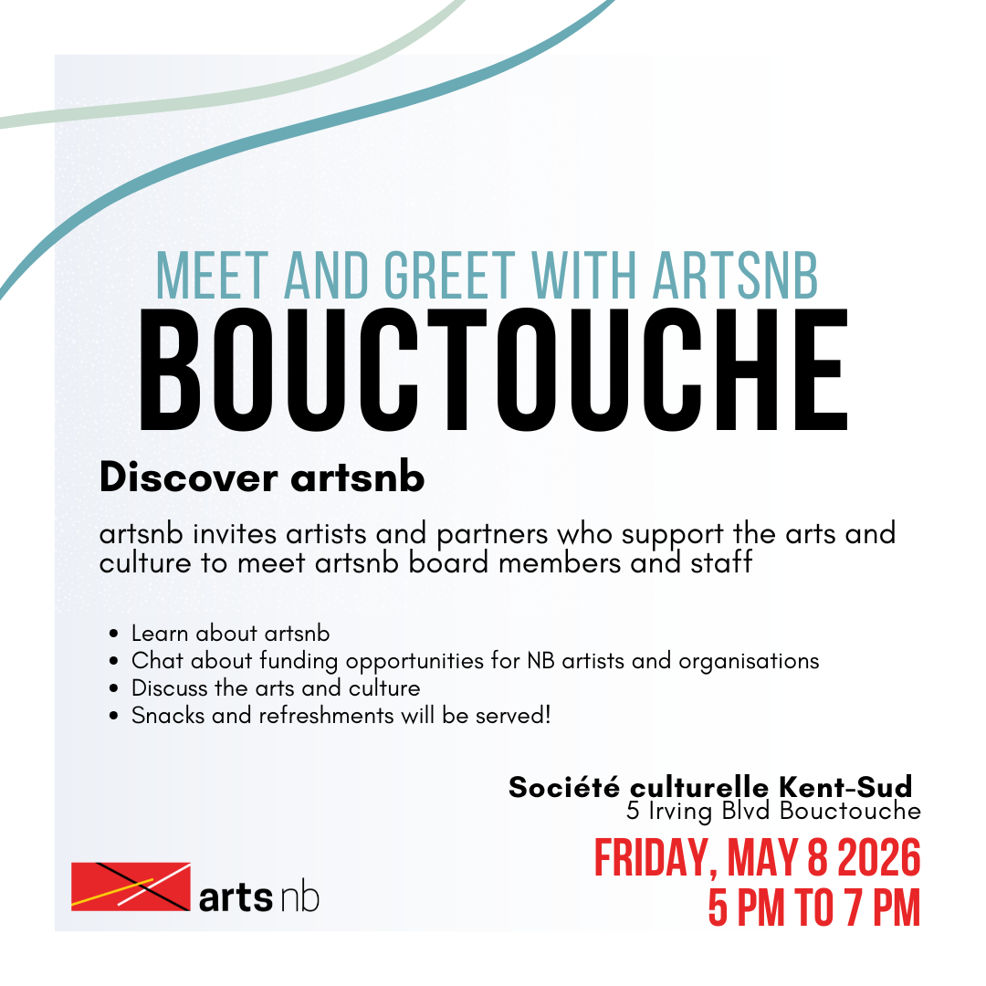 Artists of all disciplines and career levels: Learn about artsnb programs!Come chat with Rebecca Salazar, Program Officer at artsnb. Everyone is welcome. Registrations are not required. WHERE: Conference room at ArtsLink NB, 94 Prince William St, Suite 303, Saint John. WHEN: Tuesday April 14, 2026. 10 AM – 11:30 AM. Email comm@artsnb.ca with your questions.