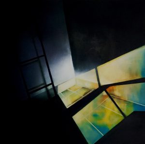 Mes œuvres s’inspirent des espaces urbains et de l’énergie collective que nous y ressentons. Dans Etereo [Éthéré], j’ai exploré l’architecture de la nature en rapport avec le patrimoine bâti du Old North End de Saint-Jean. Sur les panneaux de bois de cette série, j’utilise de la cochenille, un pigment naturel qui provient d’insectes femelles vivant sur des cactus du Mexique et produisant une riche couleur rouge carmin. J’ai puisé dans l’environnement urbain de Saint-Jean en réfléchissant à l’énergie impalpable qui circule dans et entre les espaces. Dans ma pratique j’insiste sur la lumière comme symbole de l’énergie vitale et invisible qui habite l’architecture tout en faisant honneur aux ressources naturelles et aux techniques ancestrales.