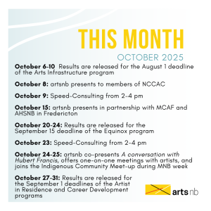 October 24-25: artsnb co-presents A conversation with Hubert Francis, offers one-on-one meetings with artists, and joins the Indigenous Community Meet-up during MNB week. Find all the information on MNB week here.