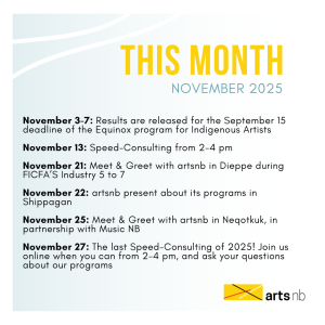 November 21: Meet & Greet with artsnb in Dieppe during FICFA’S Industry 5 to 7. More information here.
