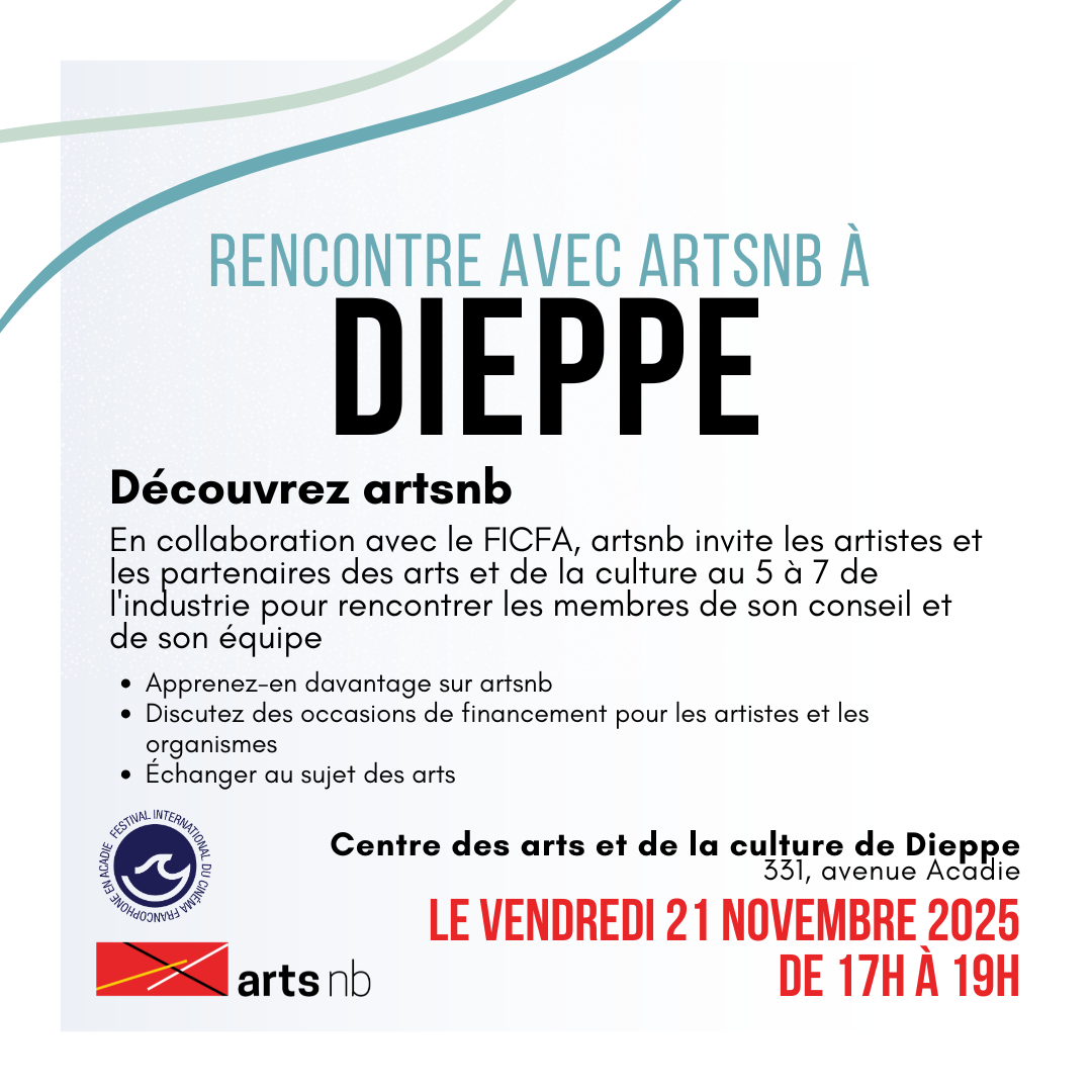 Présenté en collaboration avec le Festival international du cinéma francophone en Acadie (FICFA) : Artistes et partenaires des arts et de la culture de la région de Dieppe, venez discuter avec des membres du conseil et de l’équipe d’artsnb lors du 5 à 7 de l’industrie du FICFA. QUAND : Le vendredi 21 novembre 2025 de