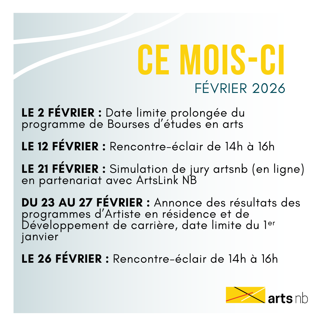 Qu’est-ce qui se passe en février chez artsnb? LE 2 FÉVRIER : Date limite prolongée du programme de Bourses d’études en arts. Plus de détails sur ce programme ici. LE 12 FÉVRIER : Rencontre-éclair de 14h à 16h. Plus de détails sur les Rencontres-éclair ici. LE 21 FÉVRIER : Simulation de jury artsnb (en ligne)