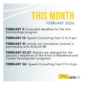 What’s happening at artsnb in February? FEBRUARY 2: Extended deadline for the Arts Scholarships program Find more information on these programs here. FEBRUARY 12: Speed-Consulting from 2 to 4 pm. Find more information on Speed-Consulting here. FEBRUARY 21: artsnb Jury Simulation (online) in partnership with ArtsLink NB. Find more information on this workshop here. FEBRUARY 23-27: Results
