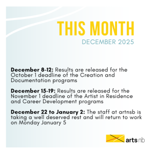 What’s happening at artsnb in December? December 8-12: Results are released for the October 1 deadline of the Creation and Documentation programs. Find them on the Results page here. December 15-19: Results are released for the November 1 deadline of the Artist in Residence and Career Development programs. Find them on the Results page here.